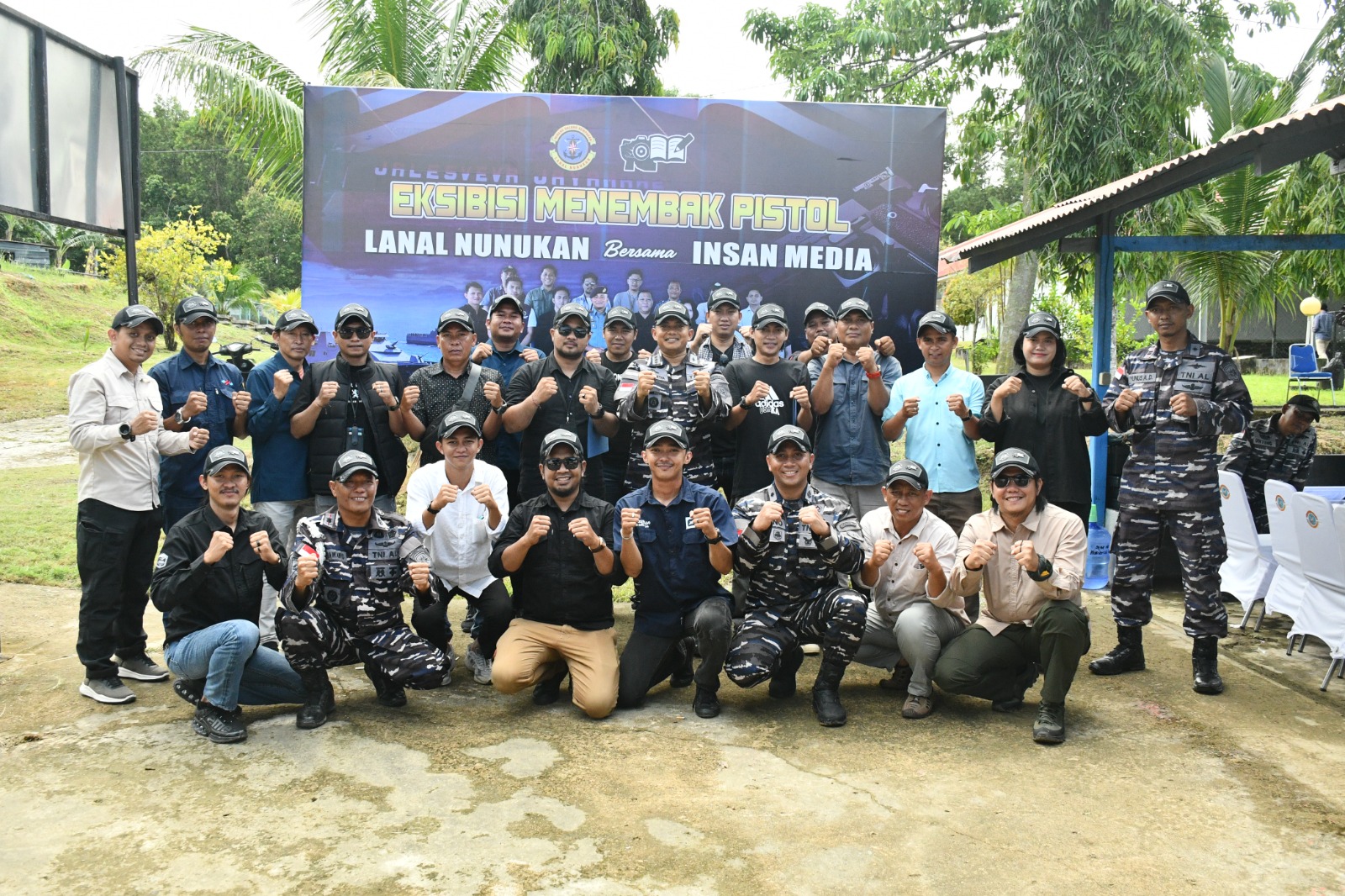 LikeKaltara.com, NUNUKAN – Selasa, 11 November 2025, Pangkalan TNI Angkatan Laut (Lanal) Nunukan menggelar Eksibisi Menembak Pistol bersama belasan insan media di Kabupaten Nunukan, dilapangan tembak Markas Komando (Mako) Lanal Nunukan, Jalan Ujang Dewa, Sedadap. Kegiatan yang diawali dengan coffee morning ini, merupakan wujud sinergitas Lanal Nunukan dan insan media di Kabupaten Nunukan. Sebelum eksibisi menembak, para rekan media mendapatkan arahan dan penjelasan tentang tata cara berada di lapangan tembak, lalu pengenalan pistol dan cara menggunakannya. Setelah itu, rekan media di data satu persatu dan empat orang bersamaan sesuai daftar urut memasuki lapangan tembak. Empat orang rekan media yang siap di posisi didampingi prajurit Lanal Nunukan, mengawali dengan persiapan, uji coba tembakan hingga penilaian tembakan.