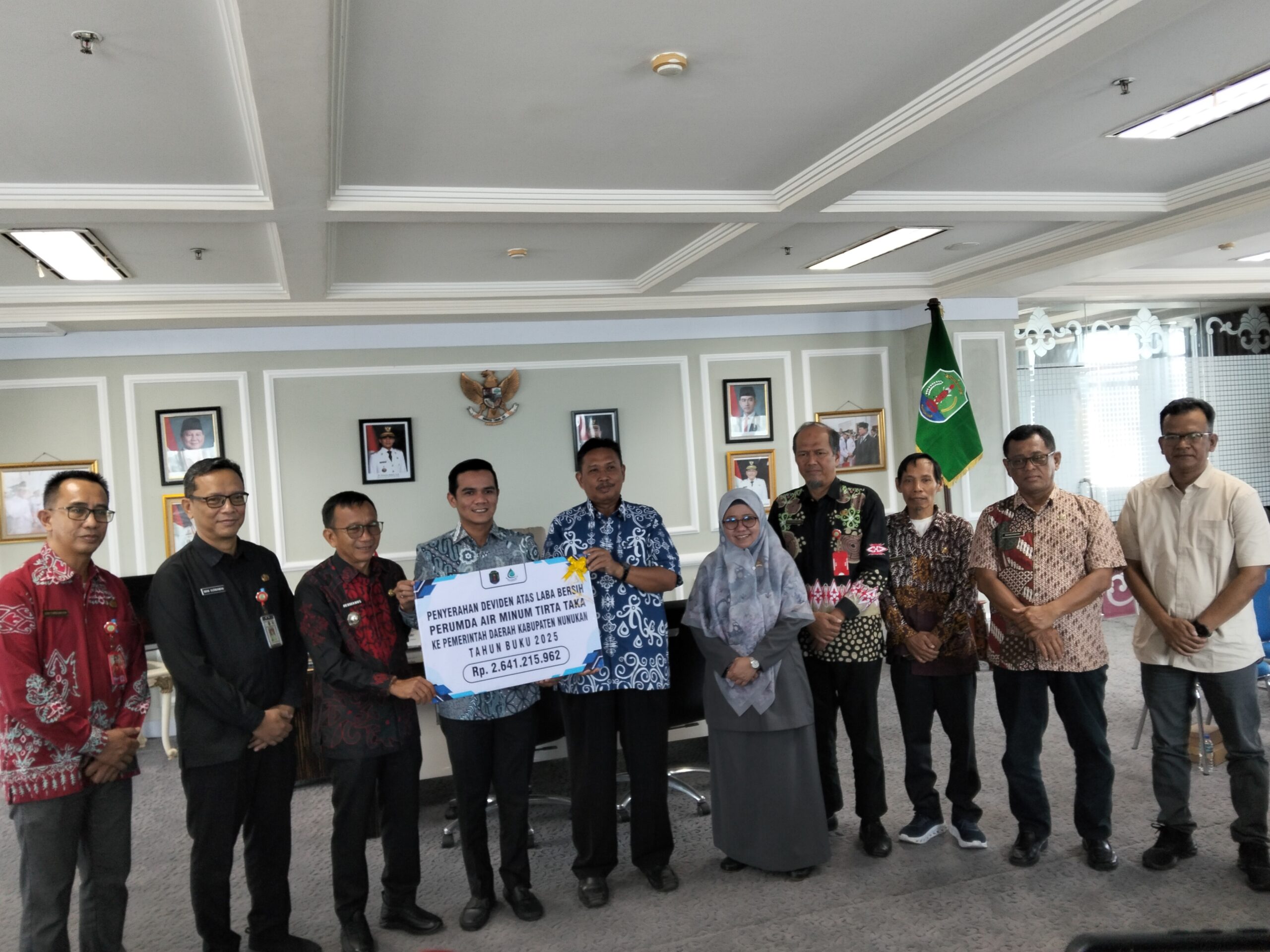 LikeKaltara.com, NUNUKAN – Jumat (27/3/2026), bertempat di ruang kerja Bupati Nunukan, Pemerintah Kabupaten (Pemkab) Nunukan menerima penyerahan dividen atas laba bersih dari Perumda Air Minum Tirta Taka Nunukan untuk tahun buku 2025, diserahkan langsung oleh Direktur Perumda Air Minum Tirta Taka, Arpiansyah, kepada Bupati Nunukan, H. Irwan Sabri. Kegiatan ini turut disaksikan Wakil Bupati Nunukan Hermanus, Wakil Ketua DPRD Nunukan Arfiah, Penjabat Sekretaris Daerah Nunukan Raden Iwan Kurniawan, para Asisten, Kepala Organisasi Perangkat Daerah (OPD) dan kepala Bagian.