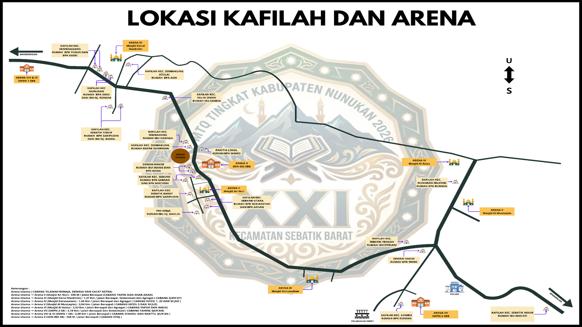 Untuk pemondokan, kafilah dari masing-masing kecamatan akan ditempatkan di rumah-rumah warga yang tersebar di Desa Liang Bunyu. Adapun lokasi pelaksanaan lomba MTQ tersebar di beberapa titik, yakni arena utama di lapangan sepak bola Desa Liang Bunyu untuk cabang tilawah remaja, dewasa, dan tuna netra. Arena lainnya meliputi Masjid An Nur cabang tartil dan tilawah anak-anak, Masjid Darul Muslimin cabang qira’at, Masjid Darussalam cabang hifdzil qur’an golongan 1, 20, dan 30 juz, Masjid Al Mustaqim cabang hifdzil qur’an golongan 5 dan 10 juz. Kemudian Masjid Al Aziz cabang tafsir dan hadis, SMP Negeri 2 Sebatik Barat cabang fahmil qur’an, SMK Negeri 1 Sebatik Barat cabang syahril dan khattil qur’an, serta SD Negeri 002 Sebatik Barat cabang karya tulis ilmiah al-qur’an.